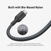 The exterior of the cable body and the connector casing is constructed with bio-based nylon, while the packaging is made of 100% recyclable paper and printed with soy ink.